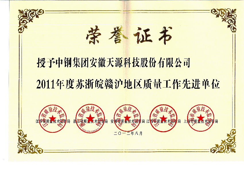 william威廉英国官网荣获2011年度苏浙皖赣沪质量工作先进单位