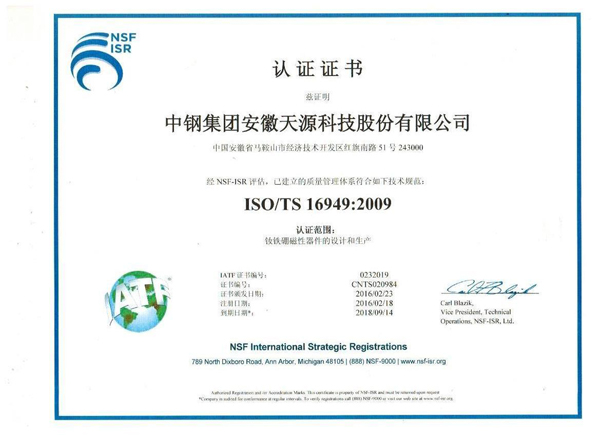 2015年12月,NSF-ISR认证公司的审核专家组对钕铁硼厂ISO/TS16949:2009质量管理体系进行了现场审核,审核专家一行2人一致认为,钕铁硼厂的质量管理体系是充分、适宜和有效的,并推荐予以认证。2016年2月23日钕铁硼厂正式取得ISO/TS16949:2009质量管理体系的认证证书,为钕铁硼厂开拓新能源汽车市场提供了基础。