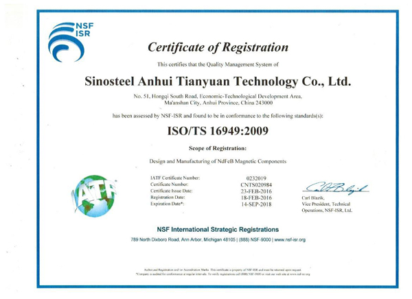 william威廉英国官网钕铁硼厂ISO/TS16949:2009质量管理体系认证工作,经过半年多时间的积极准备,顺利通过了审核专家组的审核,近日收到了NSF-ISR认证公司颁发的认证证书。